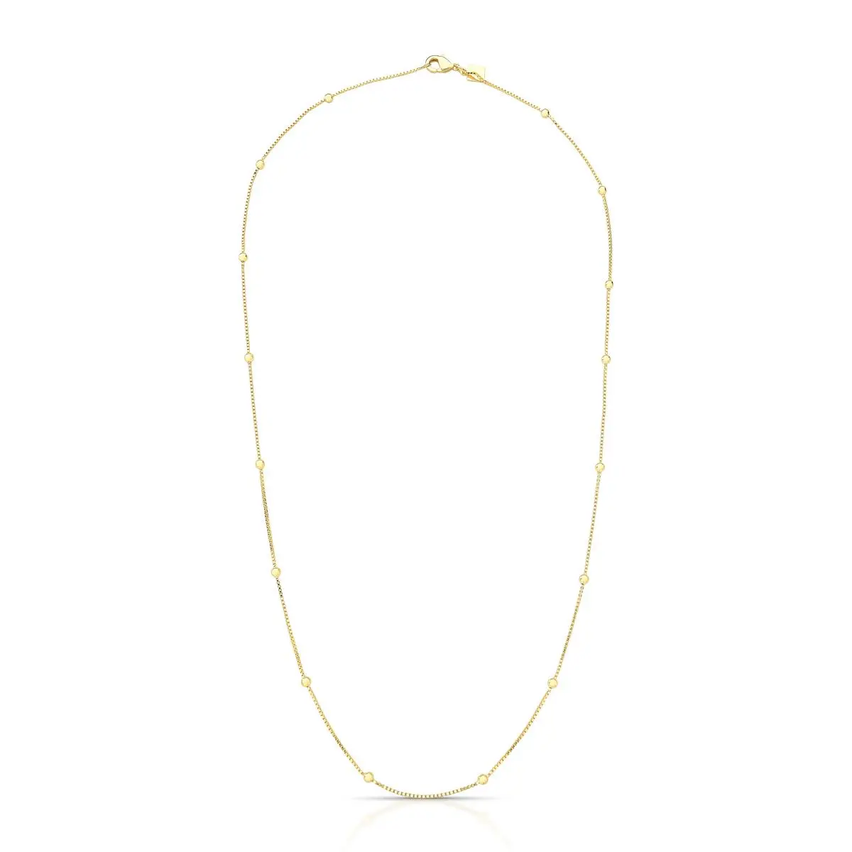 A Corrente com Bolinhas Lisas Dispersas Banhada a Ouro – 50 cm traz delicadeza e sofisticação na medida certa. Seu design com bolinhas lisas distribuídas ao longo da corrente cria um efeito leve e moderno, adicionando um toque sutil de brilho ao visual.