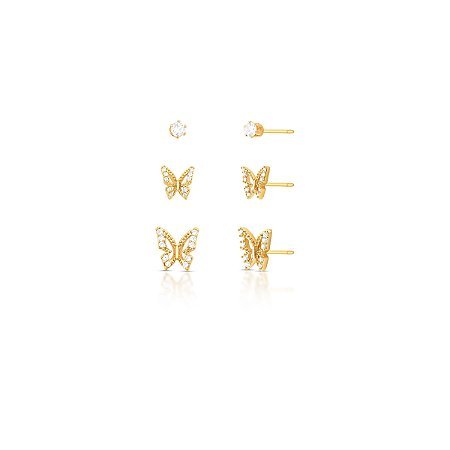 TRIO DE BRINCOS COM BORBOLETAS E CRISTAL REDONDO