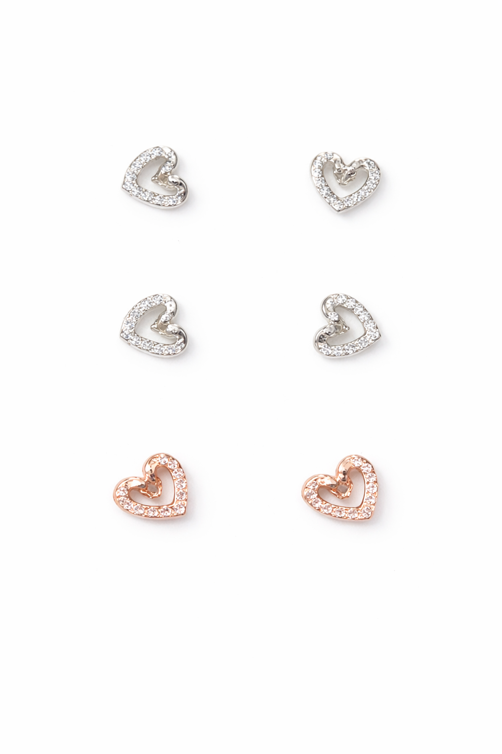 TRIO DE BRINCOS COM CORAÇÕES VAZADOS E ZIRCÔNIAS